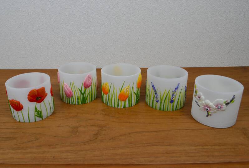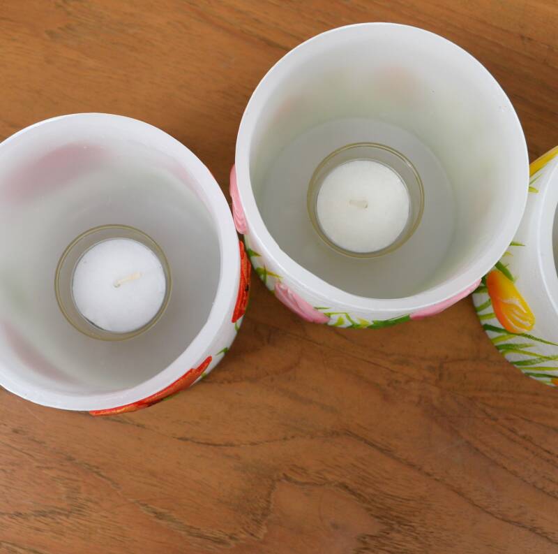 Wanneer je een waxinelichtje aansteekt, schijnt het licht zacht door de paraffine. Hierdoor ontstaat een warme en gezellige gloed waarbij de bloemen prachtig tot leven komen. Perfect voor een sfeervolle avond in huis.
