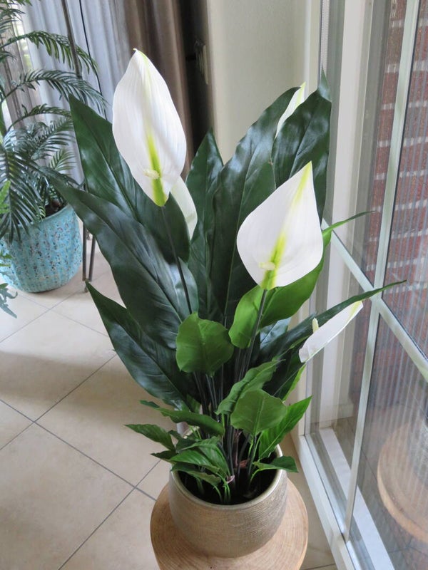 De Spathiphyllum, beter bekend als de Lepelplant, is met zijn grote groene bladeren en witte bloemen een opvallende verschijning.