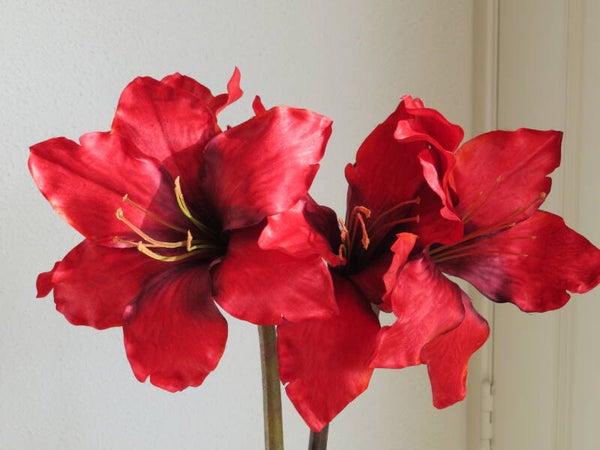 Zwarte BRYNXZ One ear fles opgemaakt met twee fel rode zijden amaryllissen van SILK-KA