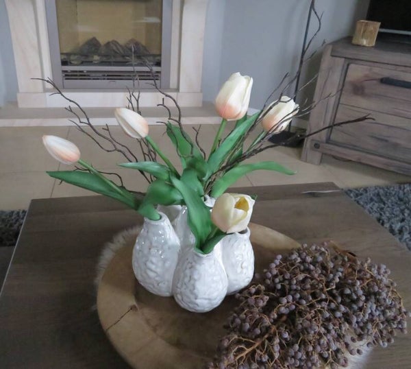 Mooi opgemaakte tulpenvaas van Countryfield met zalm/witte kunsttulpen ( 5 stuks ) en takken