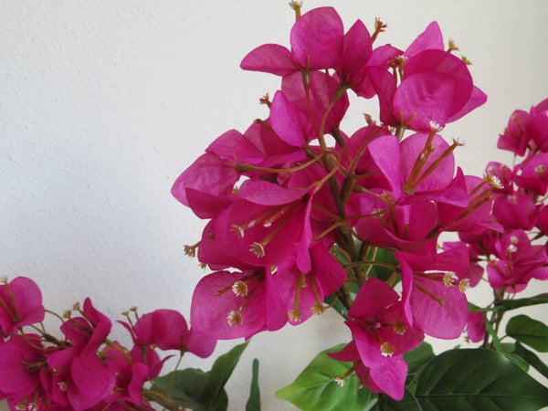 Schitterende bougainville met zijden bloemen in een zwarte kunstof pot, zodat je hem zo in een overpot kunt zetten. Levensechte stam met wortel motief.