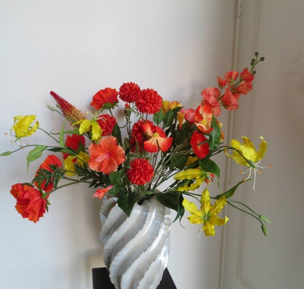 Dit boeket spreekt voor zich – een explosie van kleur en elegantie die elke ruimte tot leven brengt. De warme tinten van geel en oranje stralen zon, energie en vrolijkheid uit.