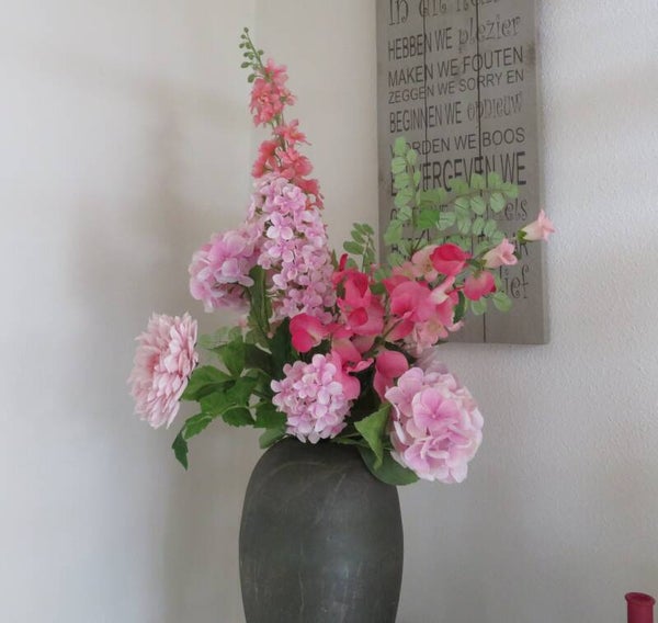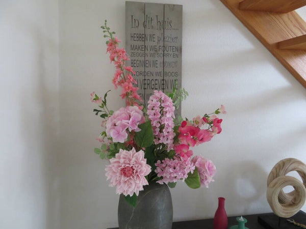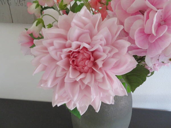 Dit prachtige boeket, Heavenly Pink, straalt pure elegantie uit met zijn zachte roze kleurstelling. De zorgvuldig geselecteerde grote bloemen, waaronder een real touch Dahlia, zorgen voor een luxe uitstraling.