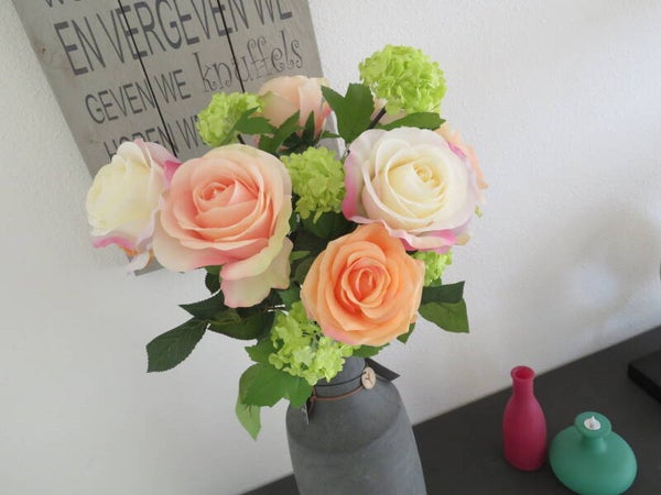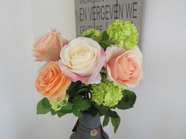 Laat je moeder weten hoeveel ze voor je betekent met dit lieflijke boeket van 8 rozen in zachte perzik- en wit/roze tinten, gecombineerd met frisgroene viburnum. Een eenvoudig maar betoverend boeket dat warmte en liefde uitstraalt – ideaal voor Moederdag of om jezelf te verwennen.