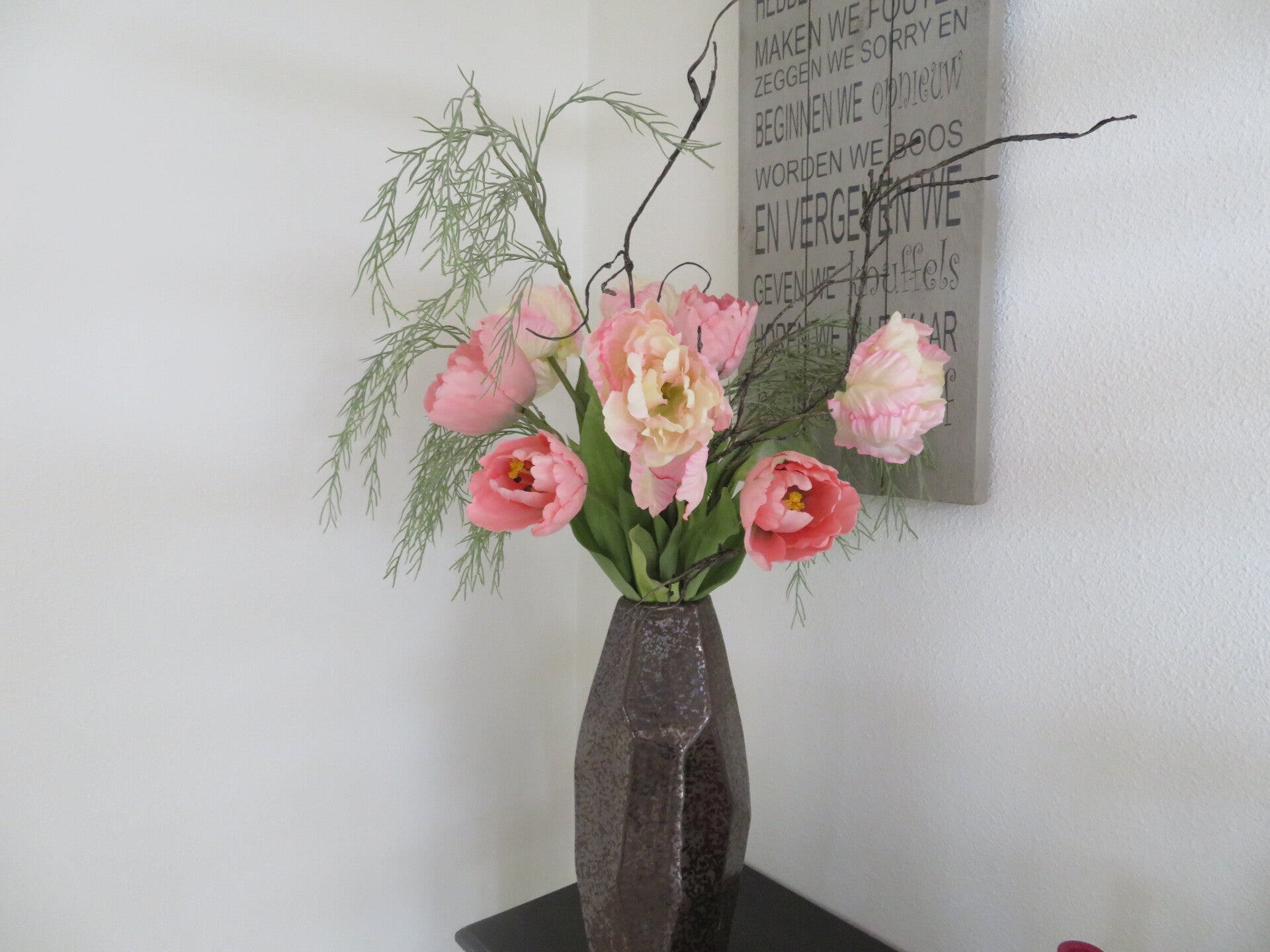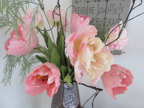 Royale papegaaitulpen in een betoverende mix van gemêleerde roze tinten vormen het stralende middelpunt van dit verfijnde boeket. De speelse vormen en levendige kleuren worden op elegante wijze aangevuld met sierlijke kunstgrastakken, wat zorgt voor een moderne, luchtige uitstraling. Een uniek en stijlvol bloemstuk dat warmte en verfijning uitstraalt – perfect voor elk bijzonder moment.