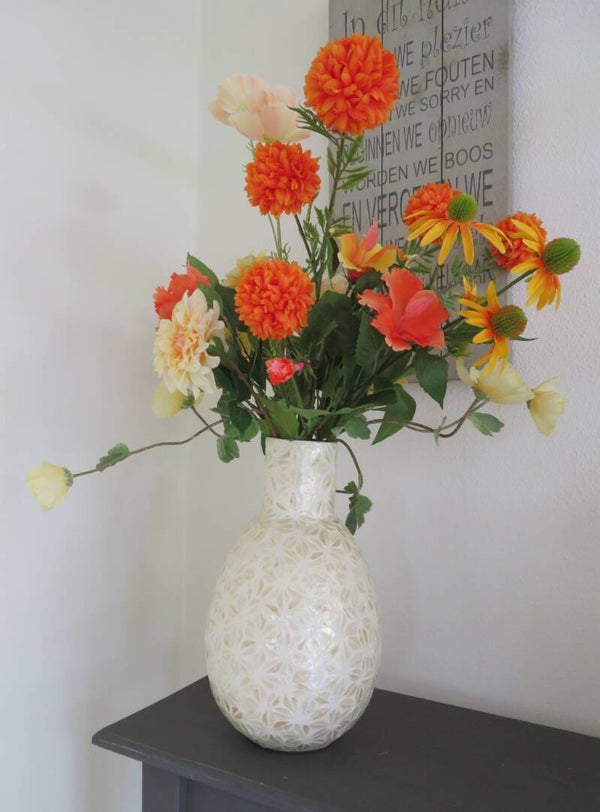 Een stralend boeket in warme geel- en oranjetinten, boordevol zomerse energie! Met een speelse mix van Hibiscus, Rudbeckia, Tagetes, Cosmos, Poppy en Dahlia brengt dit boeket gegarandeerd een glimlach op ieders gezicht.