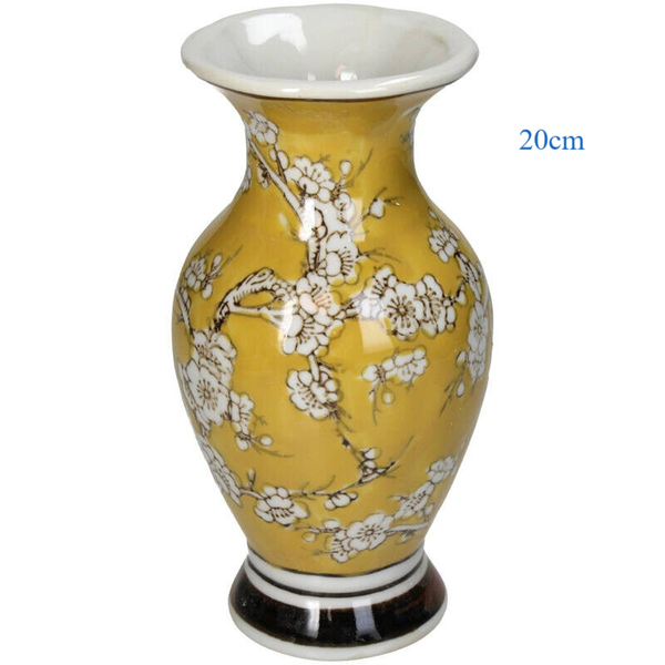 Breng verfijning en karakter in je interieur met deze exclusieve porseleinen vazen van verschillende hoogtes. Het diepe okergele glazuur vormt een warm contrast met het sierlijke, met de hand geschilderde bloesemmotief in zwart en wit. Elk detail ademt vakmanschap en tijdloze elegantie. Een stijlvol statementstuk voor wie houdt van kunstzinnige decoratie met een klassiek-oosterse flair.
