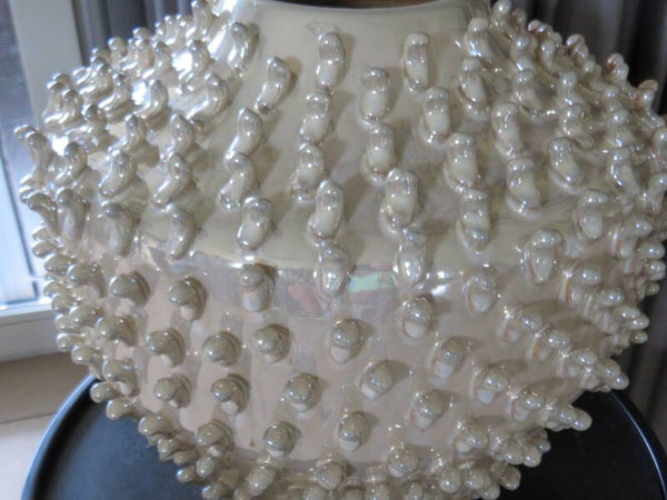 Breng elegantie en verfijning in huis met deze ronde handgemaakte keramische vaas met een luxe parelmoer glans. Deze opvallende decoratievaas heeft een bolvormig ontwerp en is rijkelijk voorzien van een speels patroon in reliëf, wat zorgt voor een uniek 3D-effect en een moderne uitstraling.