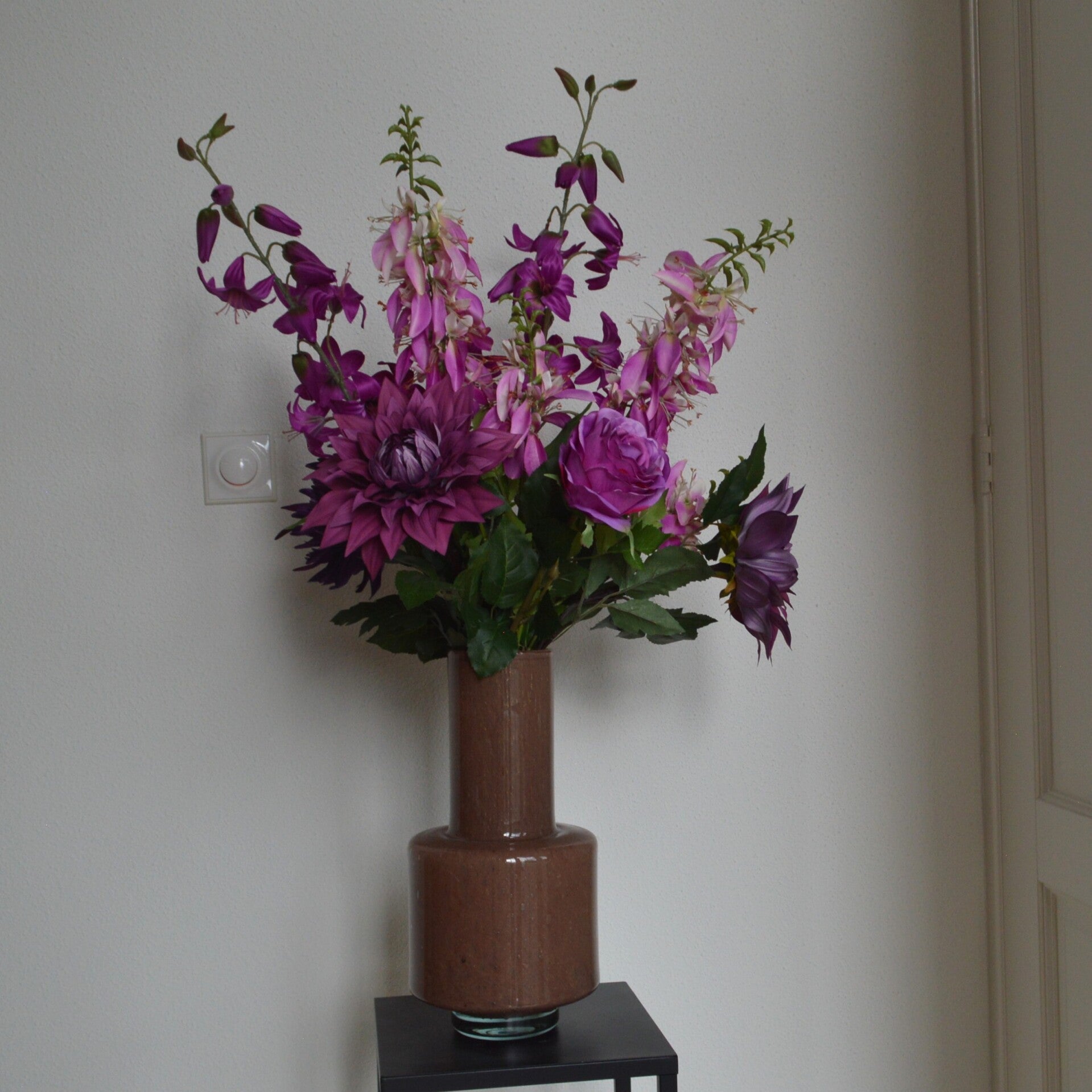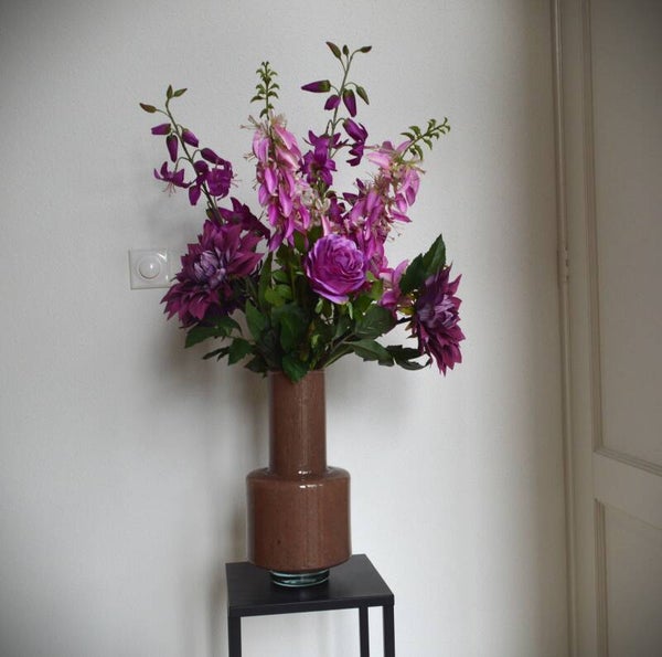 Een stijlvol en elegant boeket dat de perfecte balans vindt tussen warmte en verfijning. Dit boeket is samengesteld met 10 hoogwaardige kunstbloemen, waaronder chrysanten, rozen, dahlia’s en lelies. De combinatie van diepe paarse tinten en zacht lila zorgt voor een luxueuze uitstraling die in elk interieur tot zijn recht komt.