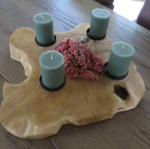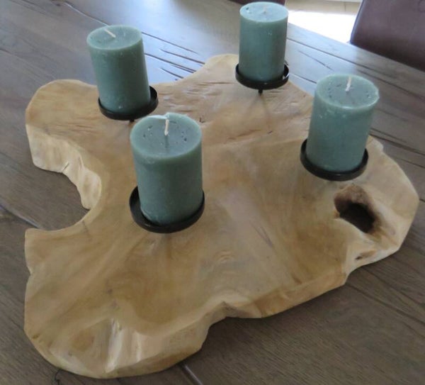 Uniek en stoer stuk teakhout, omgetoverd tot stijlvolle kaarsenhouder.