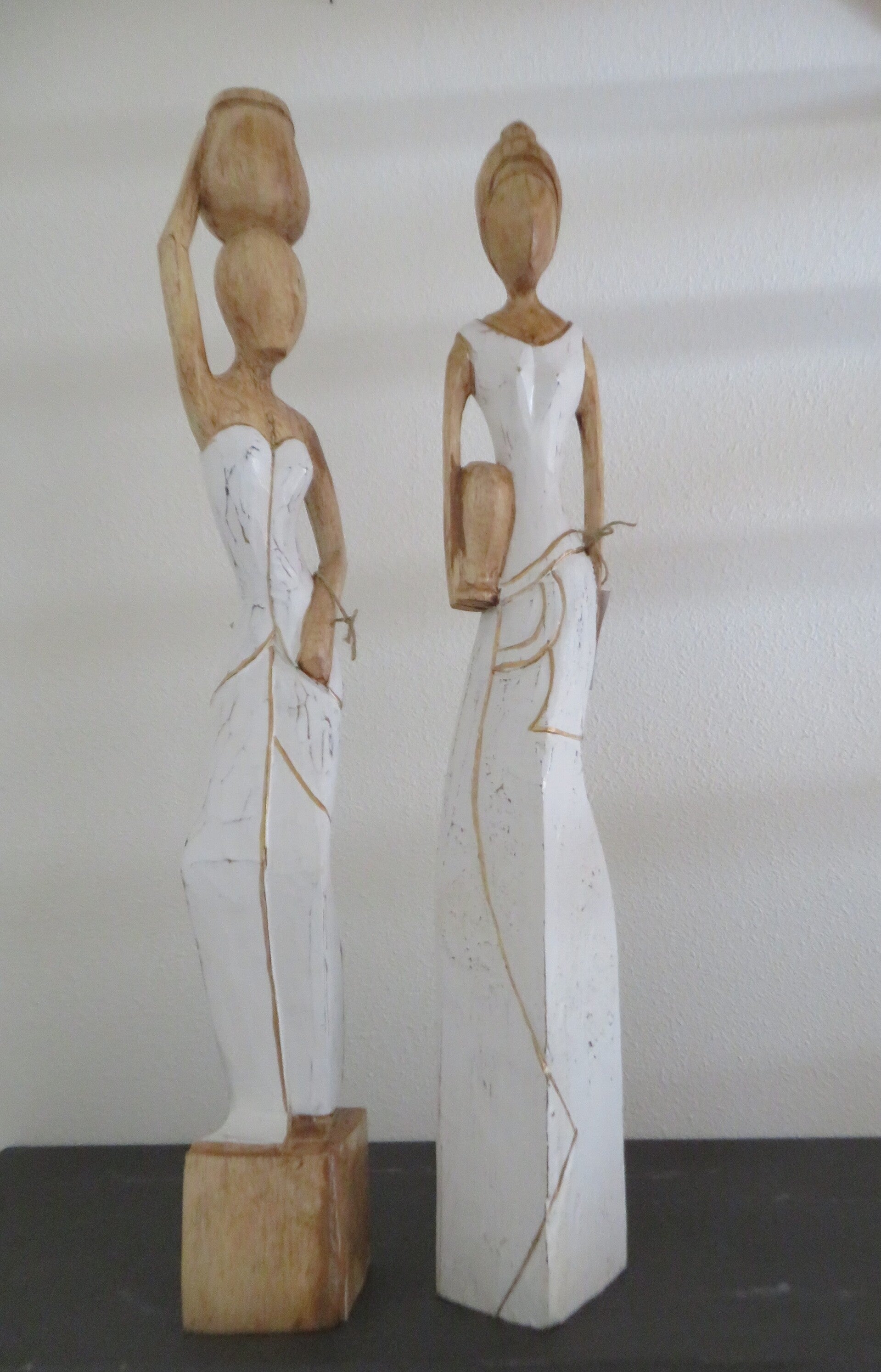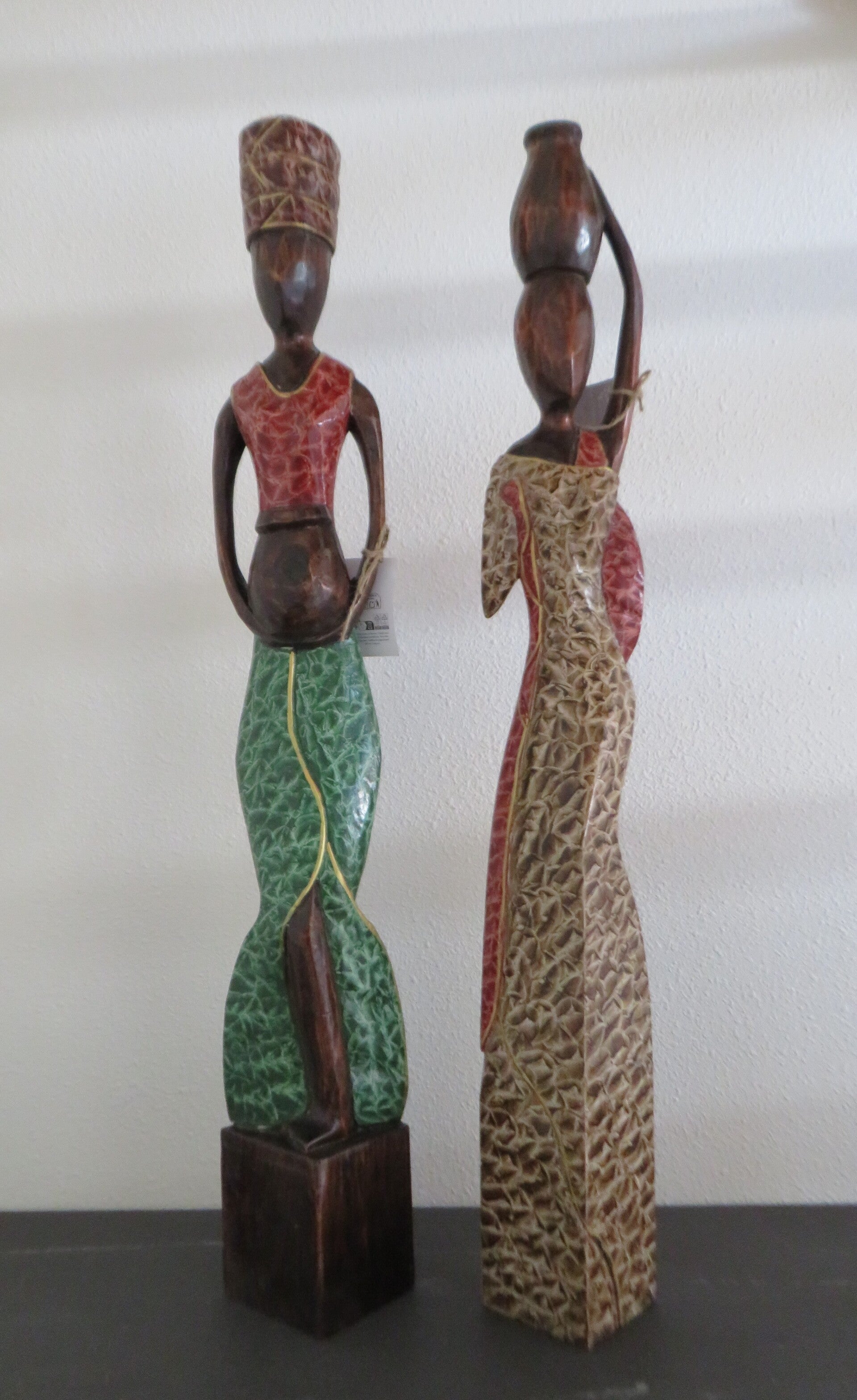 Perfect voor gebruik als decoratief statement in woonkamers, gangen of kantoren. De beelden stellen vrouwen voor in traditionele kledij en met potten, wat een culturele en rustieke uitstraling geeft.