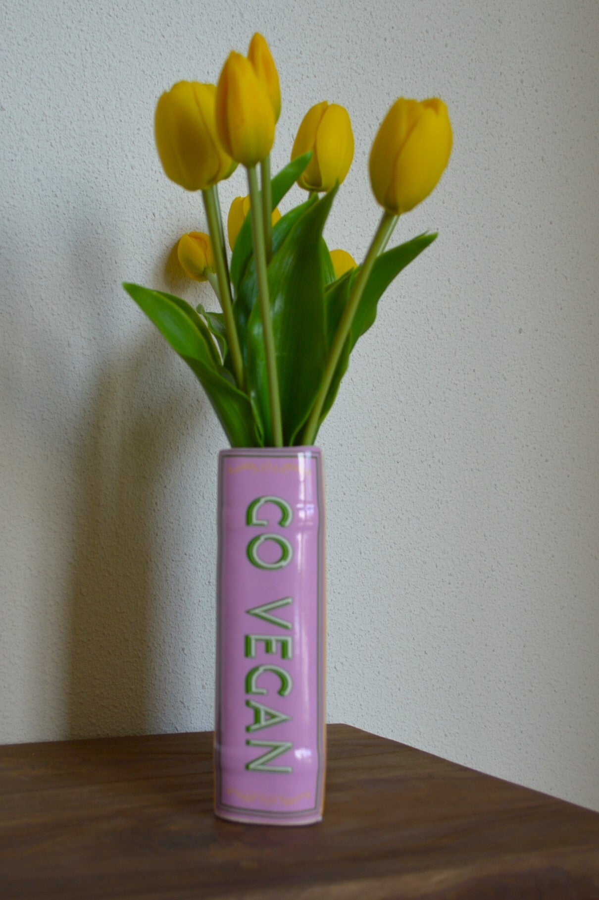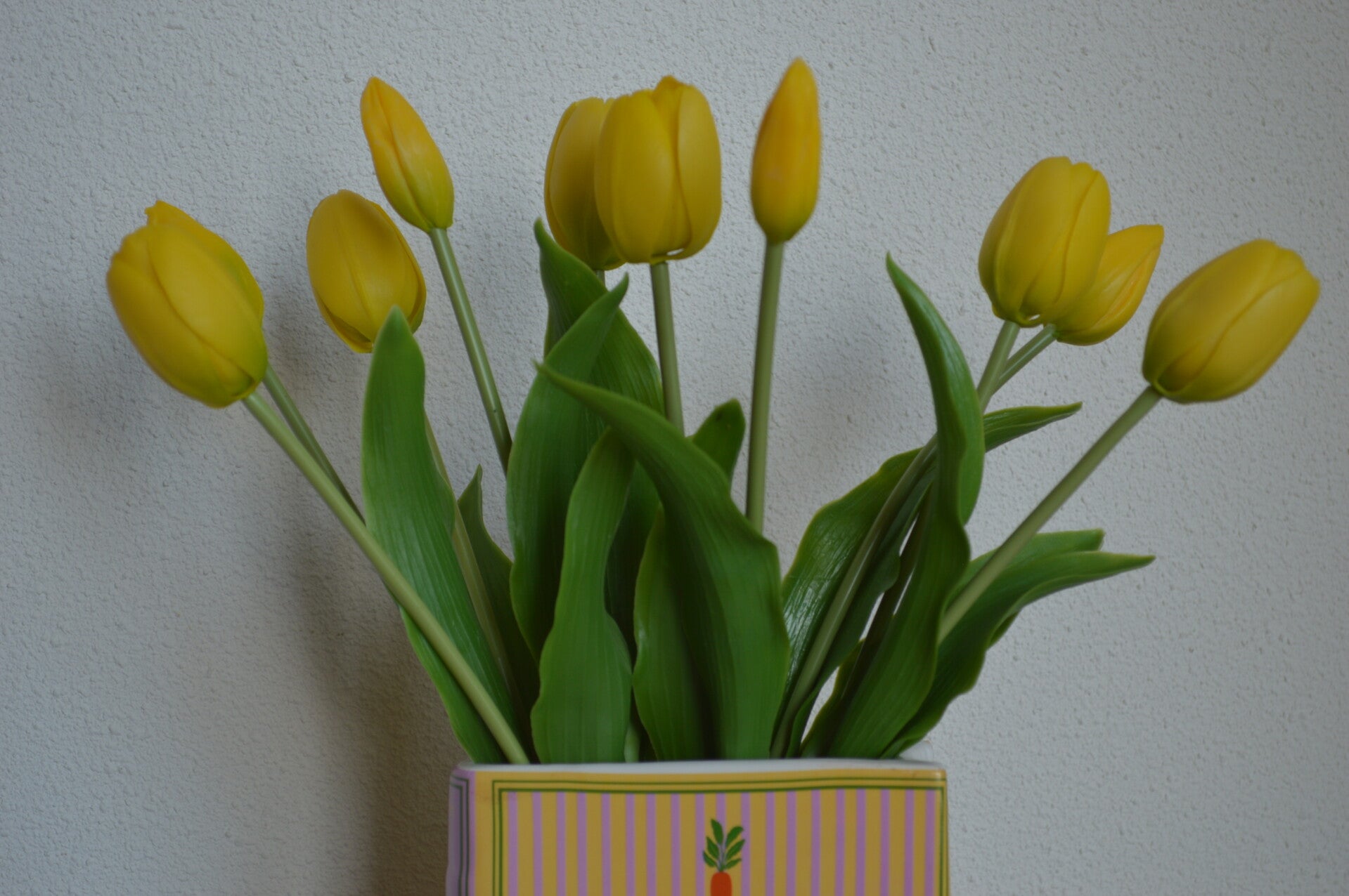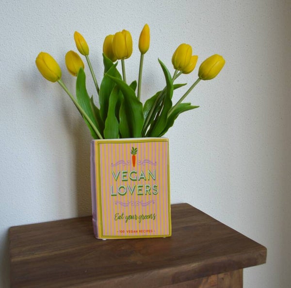 Deze boekvaas combineert zachte strepen met een knipoog naar groen leven. De gele tulpen maken het licht, bijna lente-in-huis.