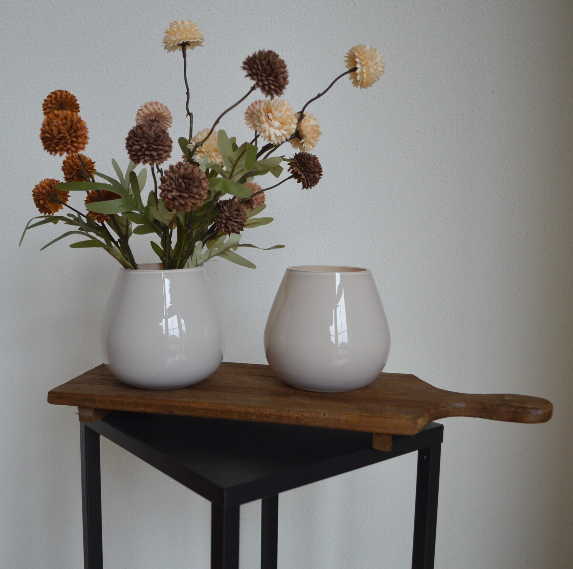 Deze stijlvolle tafelset is exclusief samengesteld door Woonyard en combineert de elegante Tasman XS windlichthouders van Vase The World in ivoor met een robuuste houten plank van 46 cm. Eén van de windlichthouders is opgemaakt met verfijnde kiku takken, waardoor de set een natuurlijke hoogte en luchtigheid krijgt.