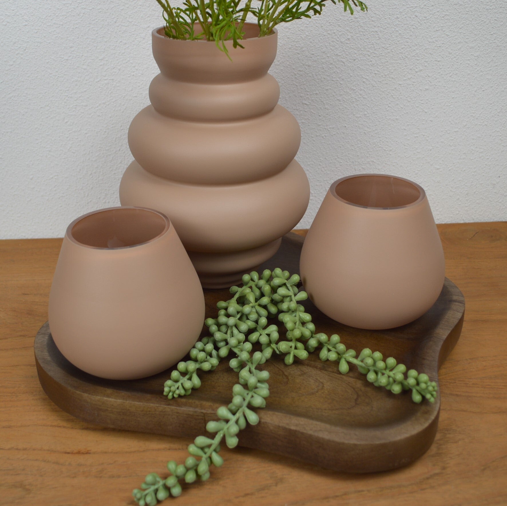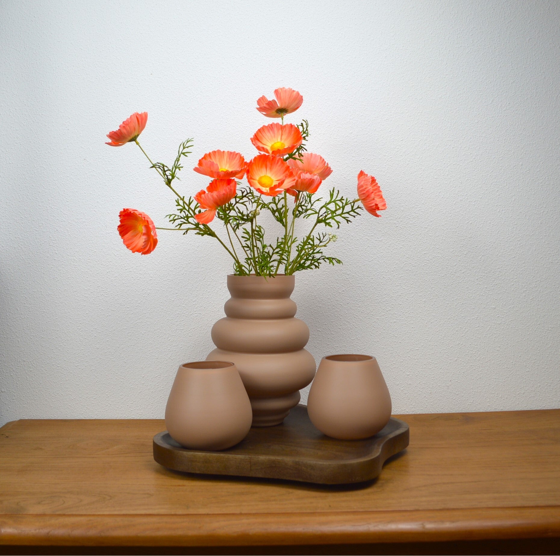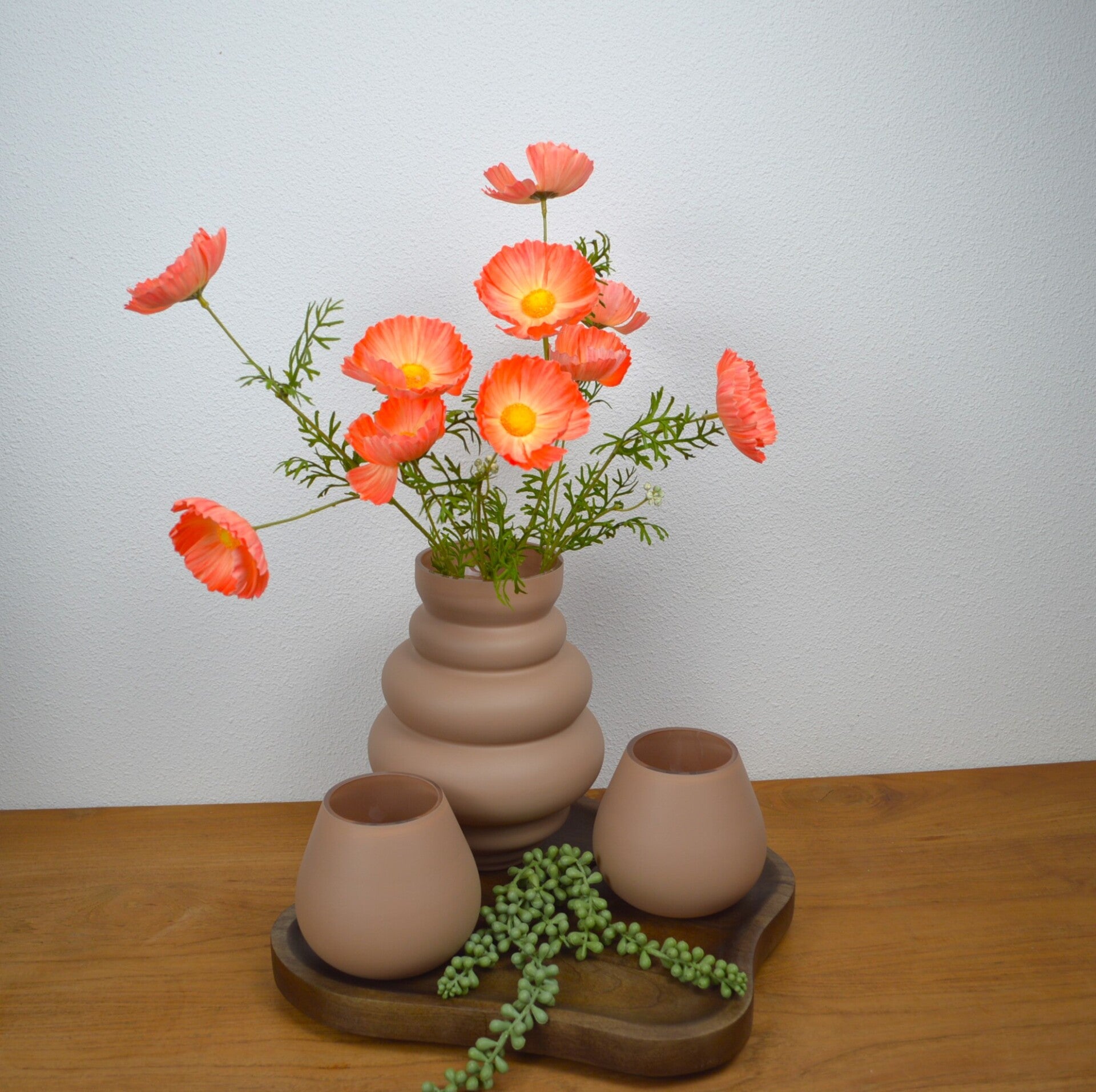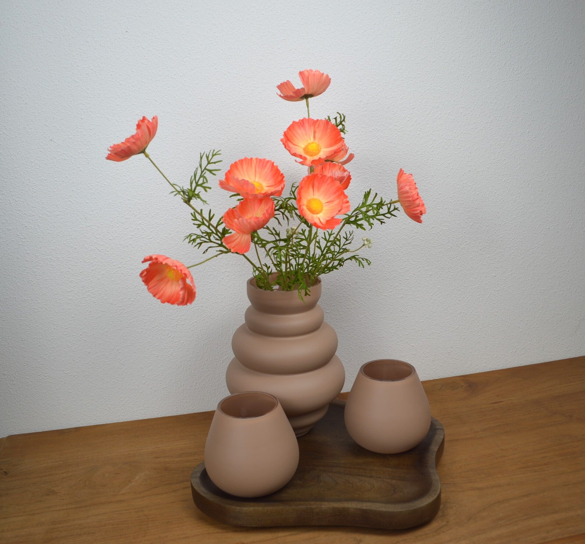 Breng verfijning en rust in uw interieur met deze exclusieve decoratieset in een elegante matte zandkleur. De set bestaat uit een designvaas van Vase The World en twee perfect bijpassende kaarsenhouders, zorgvuldig afgestemd voor een harmonieus geheel.