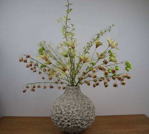 Het boeket is samengesteld met hoogwaardige zijden bloemen van Silk-ka, bekend om hun uitzonderlijke kwaliteit en realistische afwerking. De combinatie van sierlijke bloesemtakken, elegante lelies, verfijnde fritillaria en speelse hoptakken creëert een natuurlijk en luchtig geheel dat het hele jaar door in perfecte bloei staat.