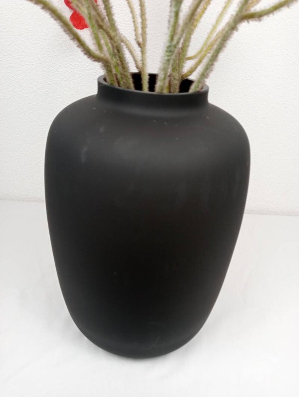 De combinatie met de levendige klaprozen van Emerald zorgt voor een speels contrast: de zachte, natuurlijke vormen en rijke rode kleur steken prachtig af tegen het strakke, matte zwart van de vaas. Een harmonie tussen rust en expressie.