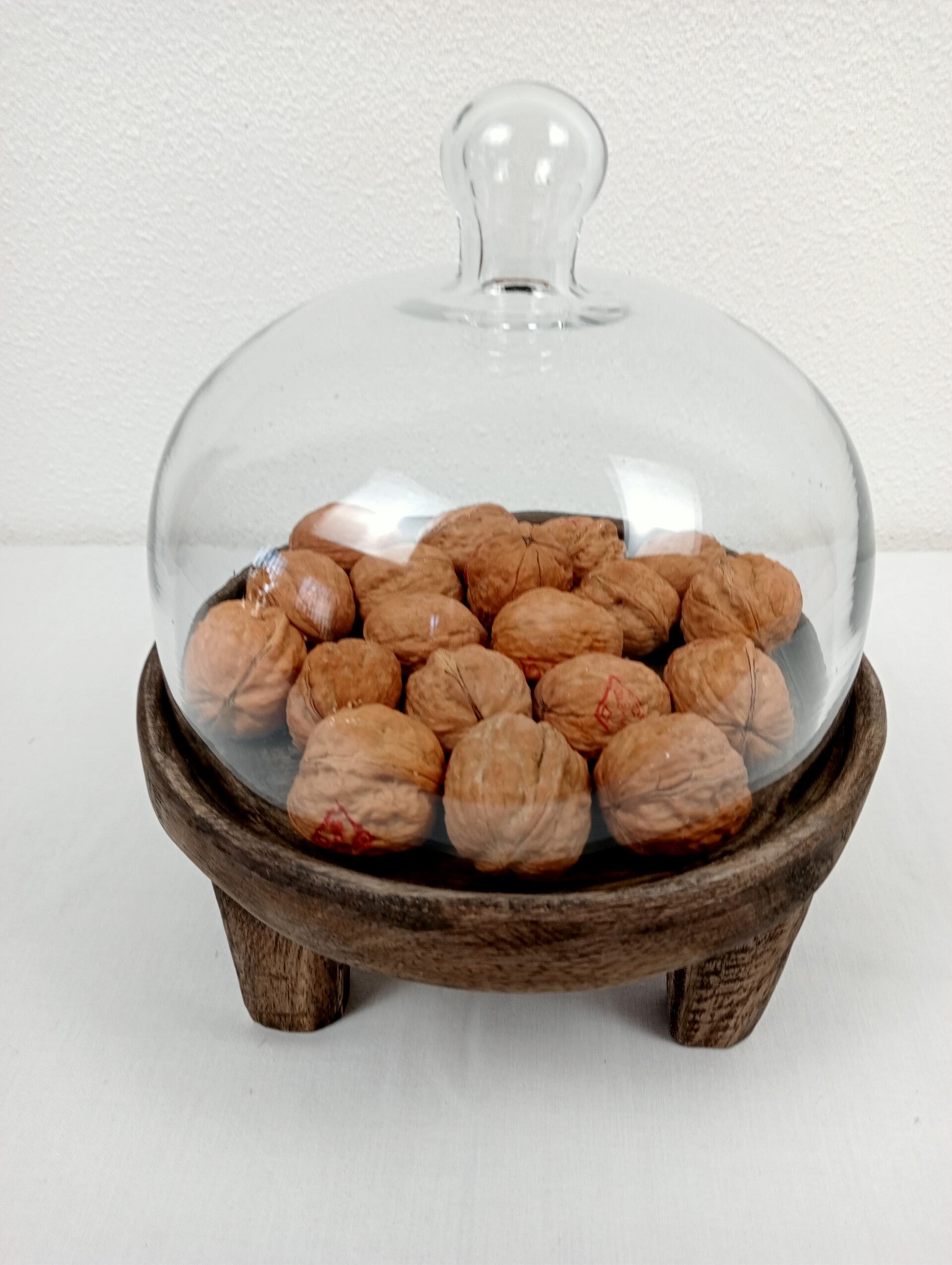 De glazen stolp rust op een robuuste houten voet met karaktervolle nerven, waardoor elk exemplaar net even anders is. Het geheel straalt rust, natuurlijke elegantie en tijdloze klasse uit. Perfect voor op de eettafel, een dressoir of als subtiele blikvanger in de keuken.