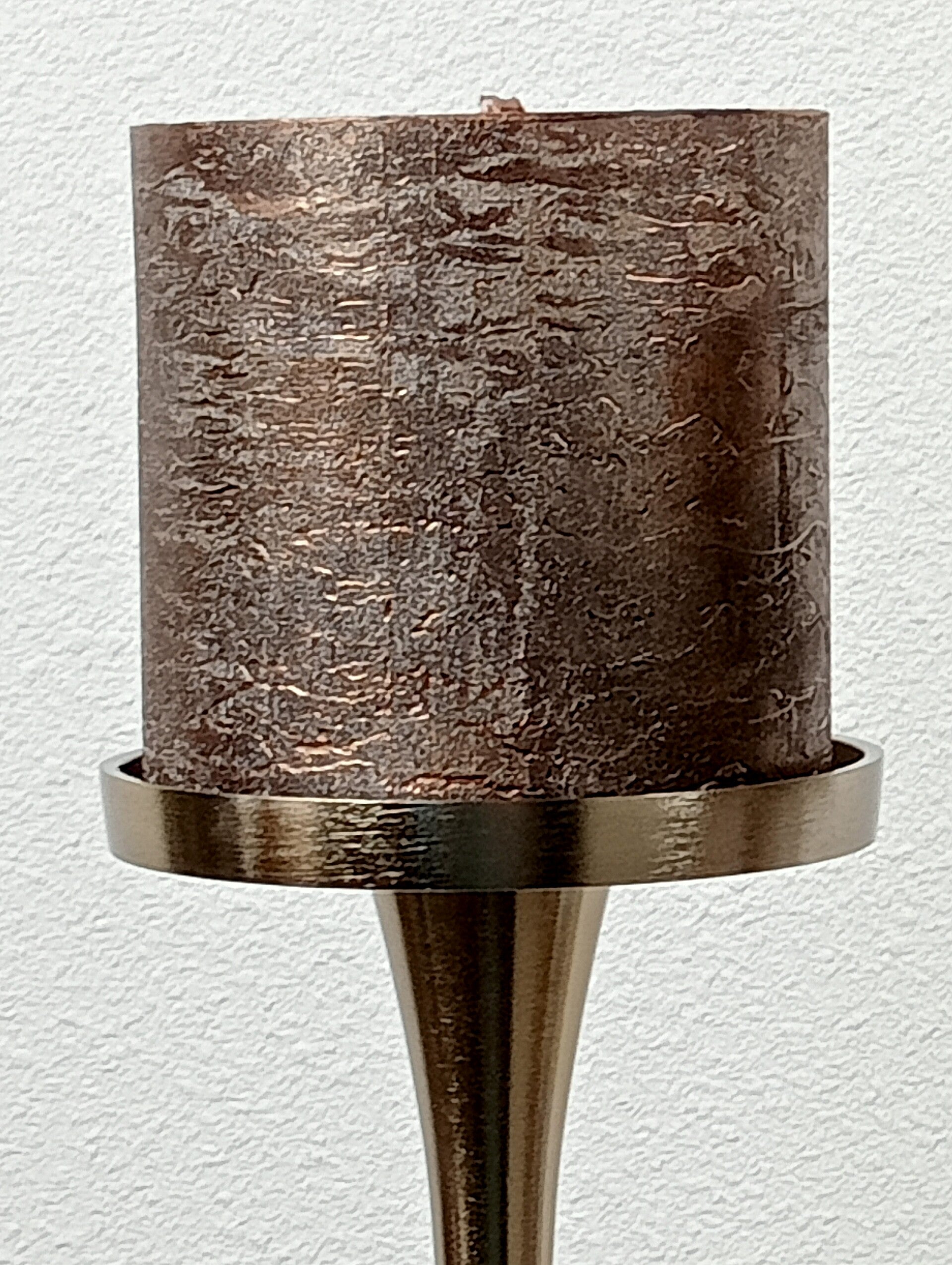 De zwarte afwerking is rijk en gelaagd. Dankzij een verfijnde polijst- en slijptechniek verschijnt er subtiel een warme bronzen gloed onder het oppervlak. Het licht van een kaars wordt hierdoor niet alleen gedragen, maar ook weerspiegeld in zachte, levendige nuances.