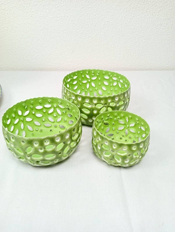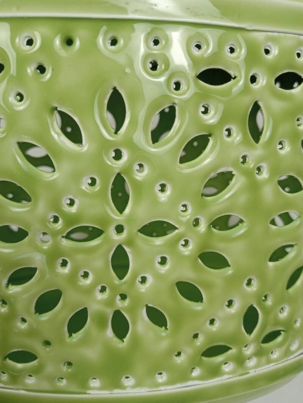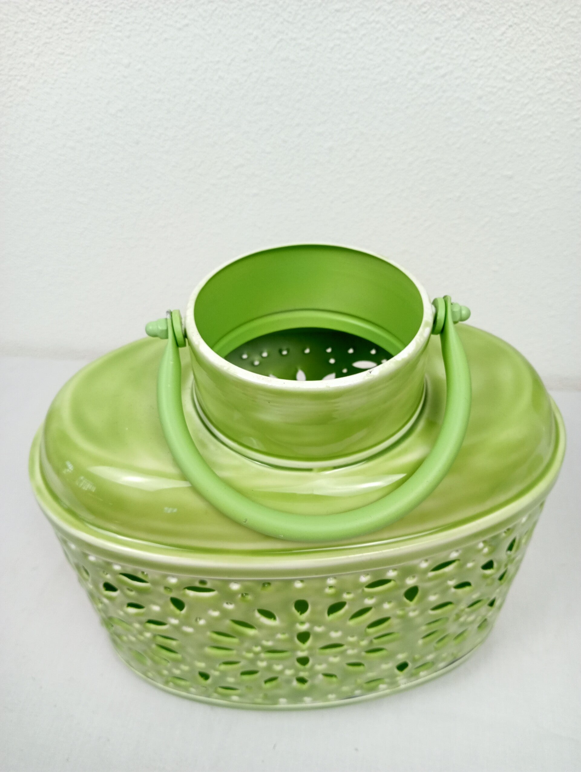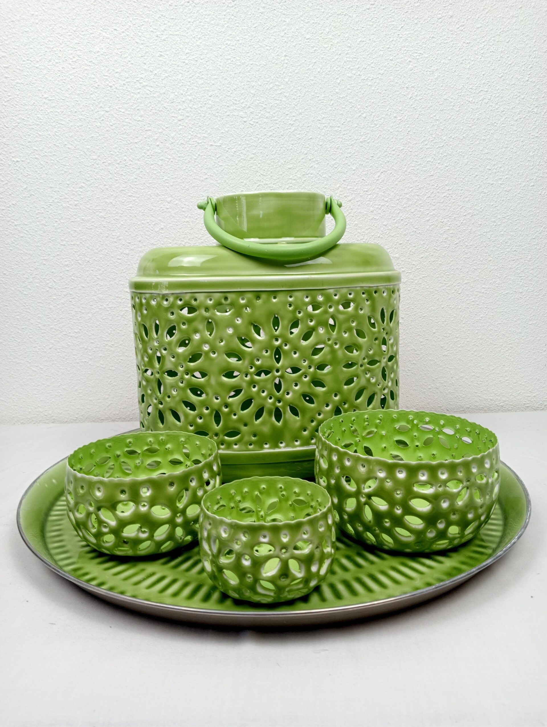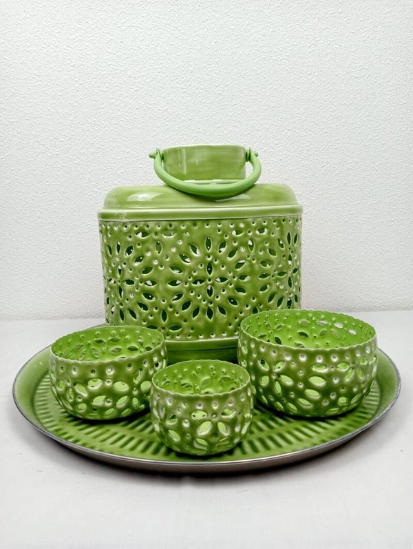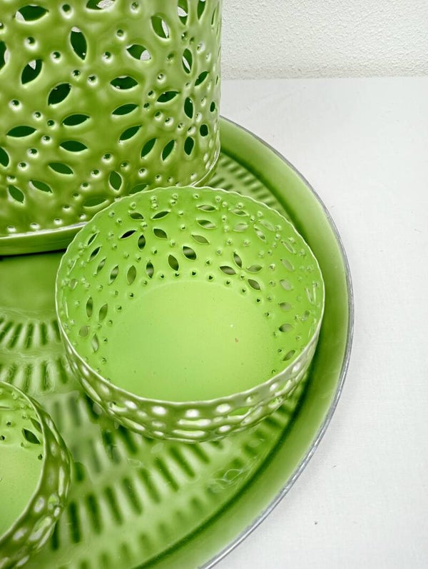 De set bestaat uit een groen emaille dienblad (38 cm) met een bijpassende lantaarn en drie windlichten. Dankzij het opengewerkte design ontstaat er een warm en speels lichteffect – perfect voor extra gezelligheid in huis of tuin.