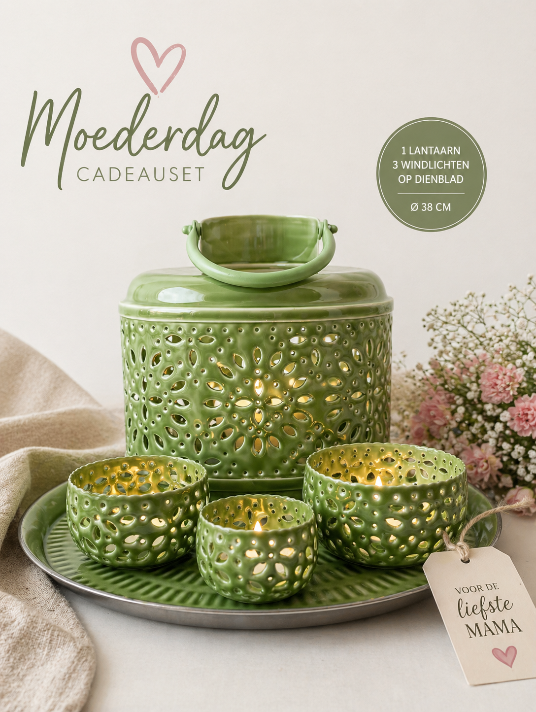 Moederdag cadeauset – Emaille dienblad met lantaarn & windlichten 💚